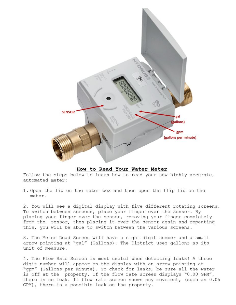 How to Read Your Water Meter: Locate the meter box located near the road on your property and gently remove the lid. (There could be wires attached and you don't want to disconnect them.) See the document below, "How to Read Your Water Meter", for step-by-step guidance.